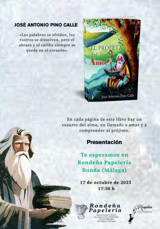 El rondeño José Antonio Pino Calle presentará finalmente este viernes su nuevo libro «El profeta del amor», después de aplazar hace unas semanas el acto. Así, será a partir de las 17.30 horas en Rondeña de Papelería, donde tanto el autor como su editorial, Magialux, esperan ver a numerosas personas que quieran conocer la nueva obra del conocido como «El poeta barrendero».